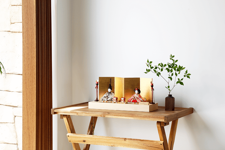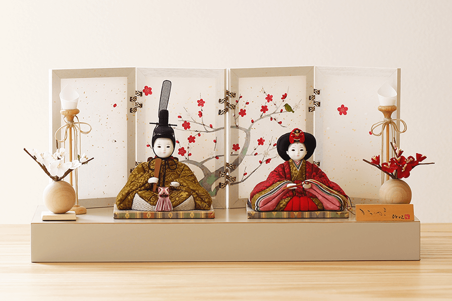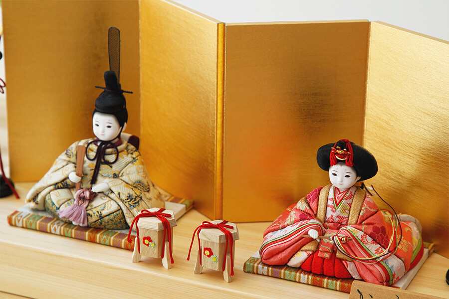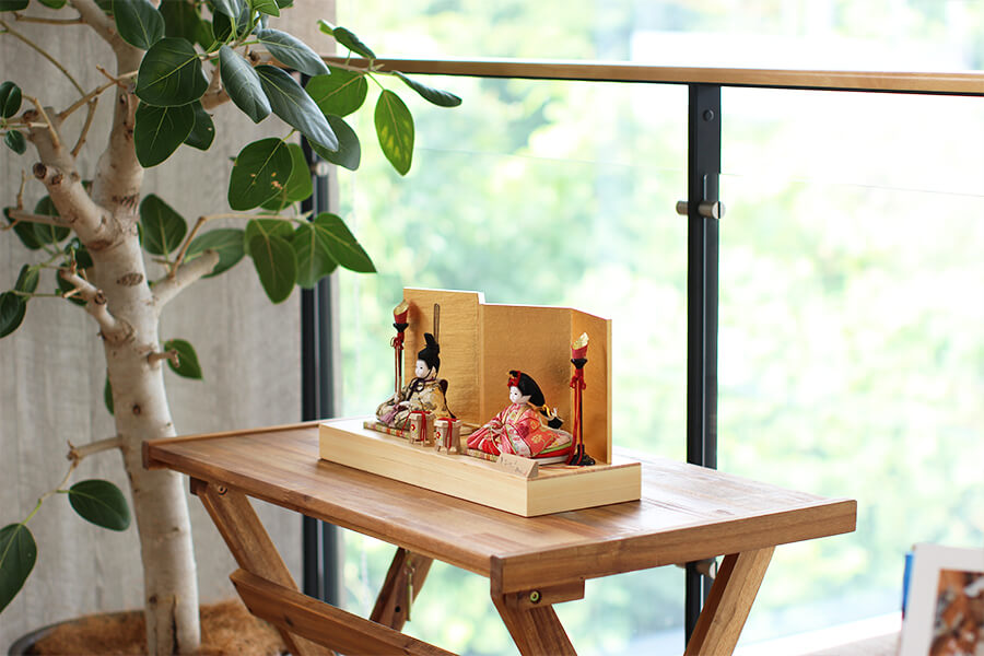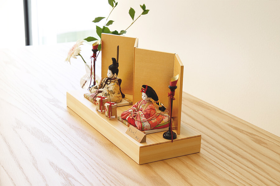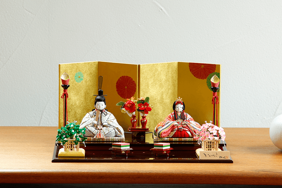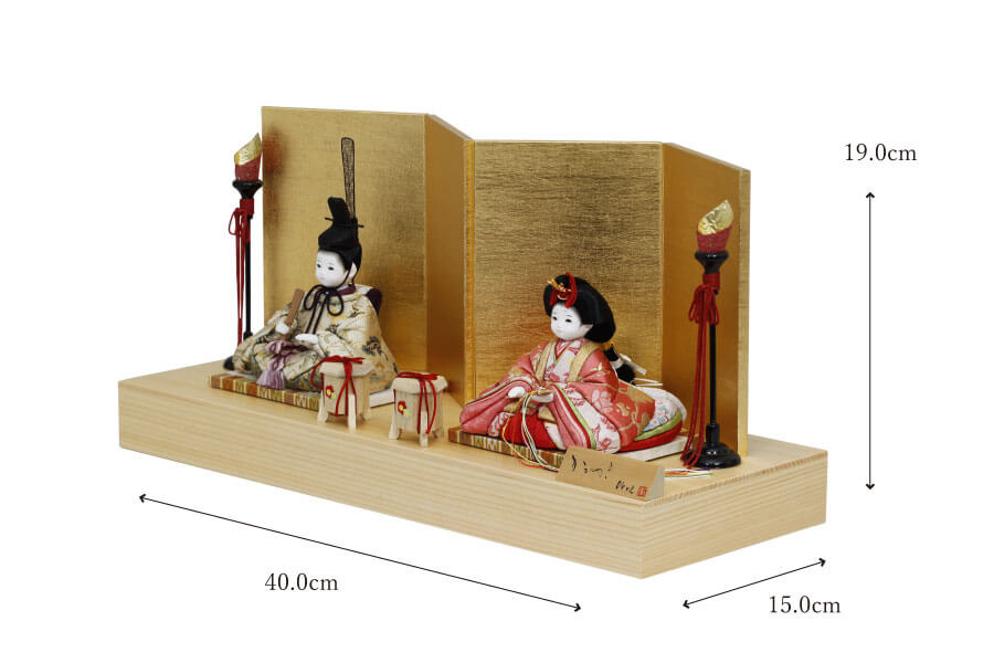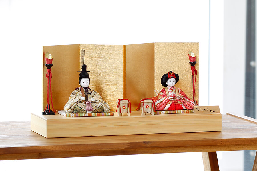 金屏風に映える男雛と女雛は、細部まで丁寧に仕立てられ、落ち着いた存在感を放ちます。木曽檜の重ね飾り台と美しい小物が調和し、コンパクトながら華やかな雰囲気を演出。
