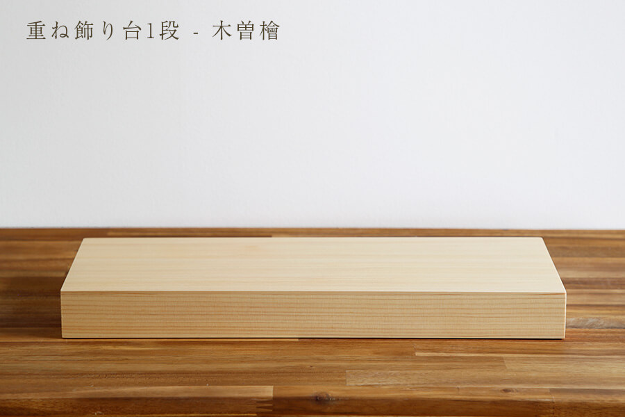 重ね飾り台1段 木曽檜:まっすぐに通った木目は柾目だからこその美しさです。2段目、3段目と重ねて増やすことができるため、少しずつお人形やお道具を増やしていきたい方におすすめです。