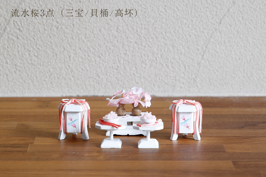 流水桜3点(三宝/貝桶/高坏):すべてに流水桜の絵付けを施しています。流水文様は、慶事が続くことを意味する縁起の良い文様です。 - お花
