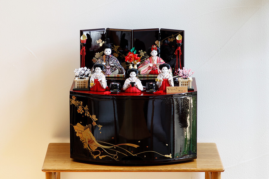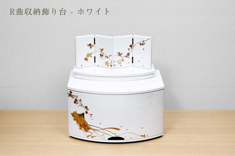 R曲収納飾り台:曲線が美しく、御所車が描かれています。お人形からお道具まで全て飾り台の中に収納することができ、引き出しタイプになっているので出し入れも簡単です。 - 屏風