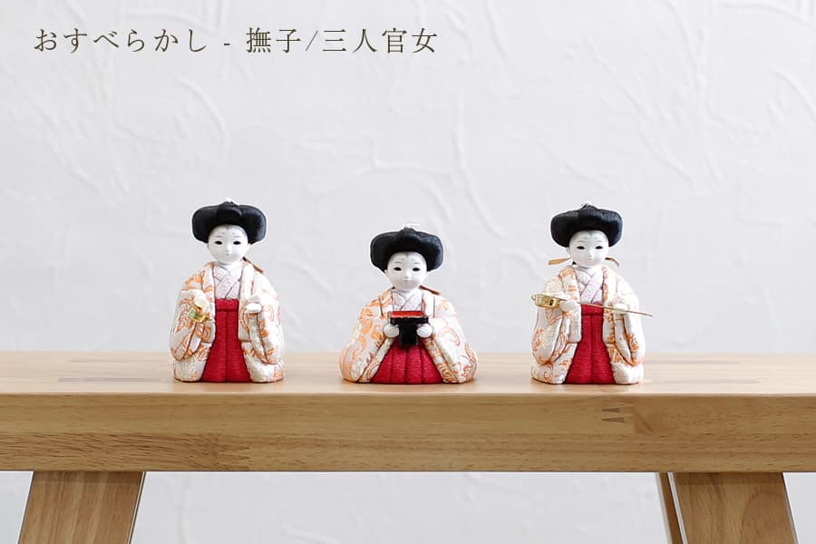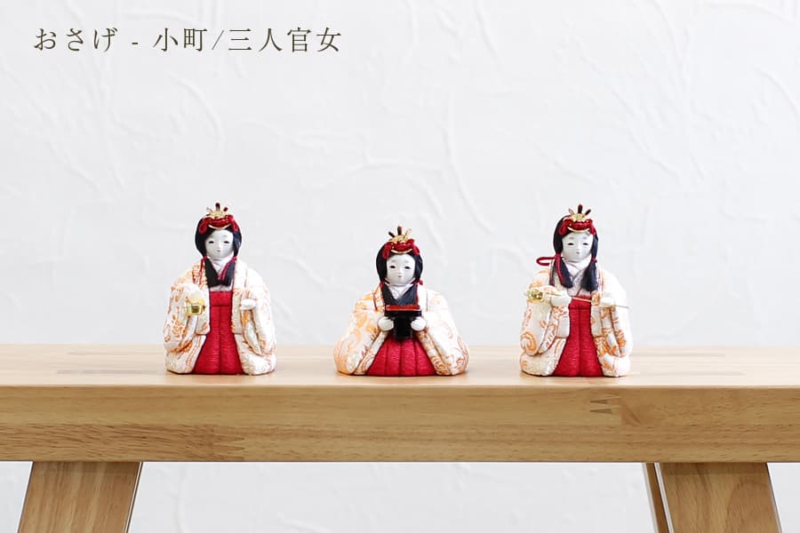 お内裏様とお雛様に加え、三人官女を揃えた華やかな飾りは、伝統の美しさと現代のセンスを融合させています。