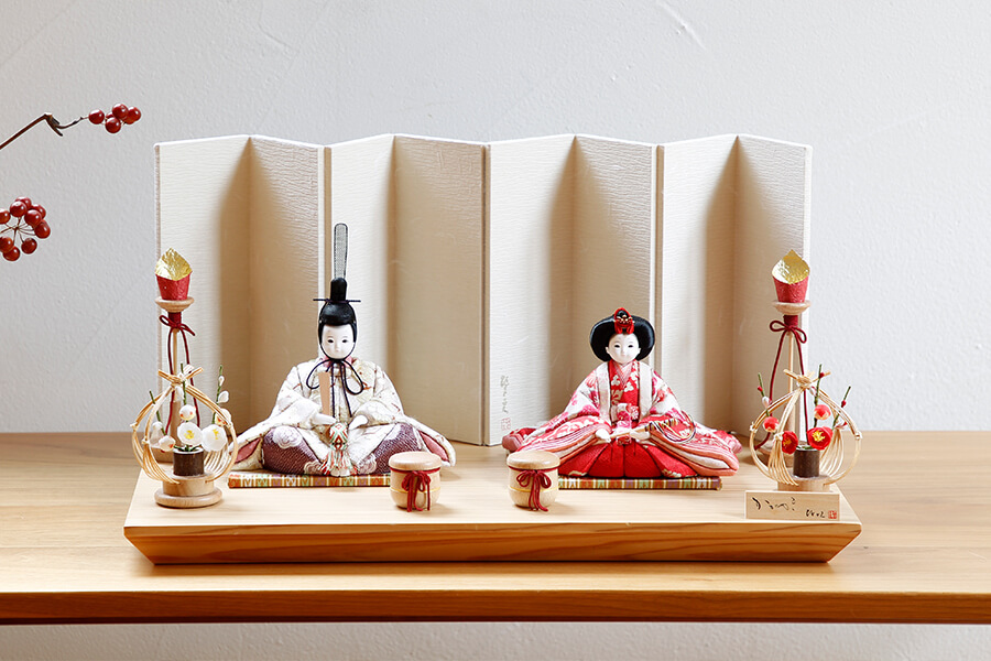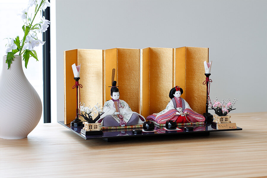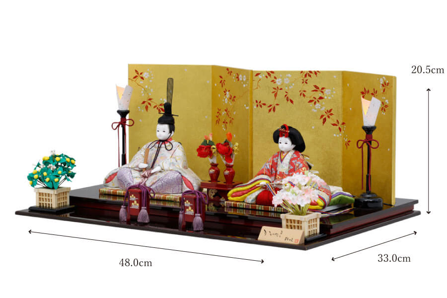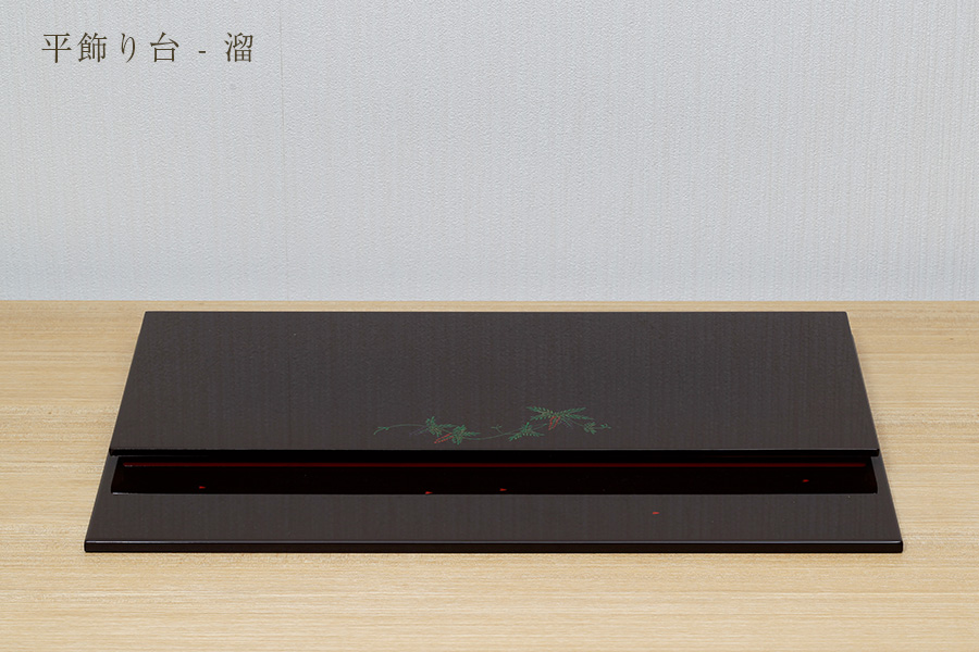 平二段飾り台:色は溜(ため)色。品の良いチョコレートブラウンです。会津の漆器職人が丁寧に仕上げました。手描きの蒔絵がお祝いに花を添えます。 - 屏風