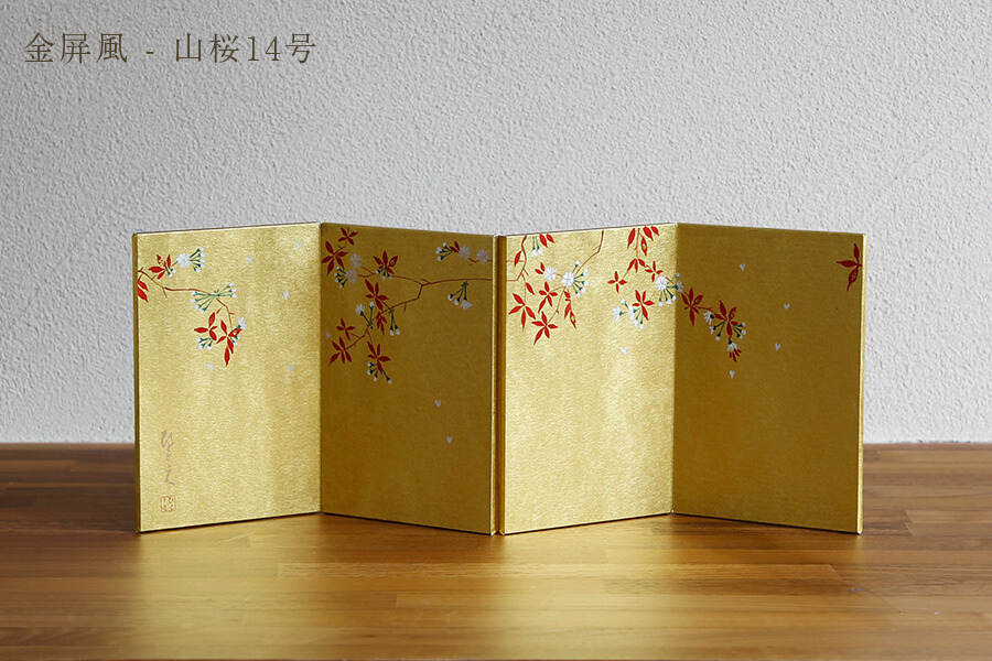 金屏風 山桜:木の板に和紙を張り合わせ丁寧に仕上げました。繊細で美しい絵付けは一筆一筆会津の職人が描いているため、作品の絵付けはひとつひとつ異なり、手づくりならではの味わい深さがあります。 ひな祭りの歌にも登場する定番の金屏風は、お雛様をより華やかに、より煌びやかに演出します。 - お道具