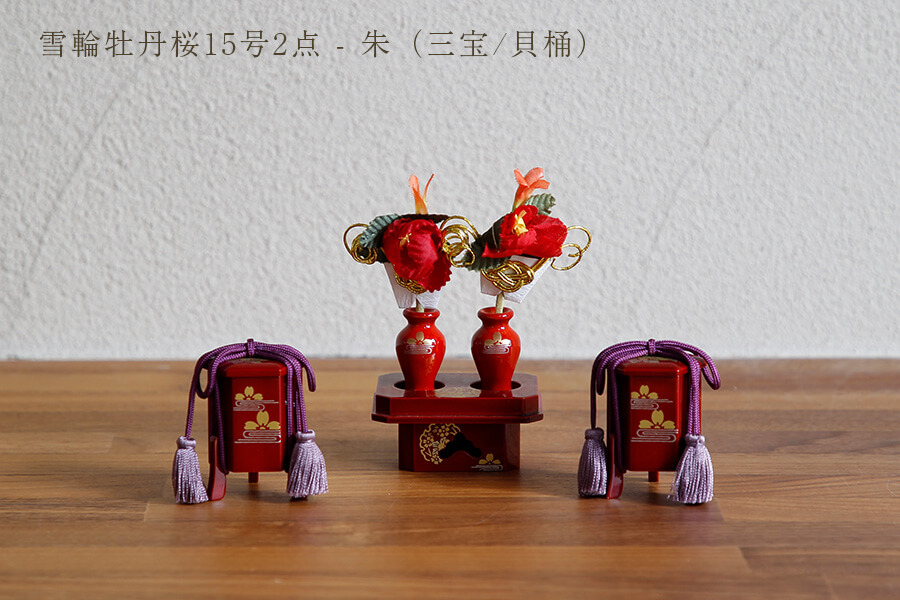 雪輪牡丹桜2点 朱(三宝/貝桶):貝桶には富貴の花と云われる牡丹や春の象徴である桜の花。桜が水面に浮かぶ流水桜文様は、慶事が続くことを意味します。 三宝に描かれた雪輪文様は豊作をもたらすと考えられた吉祥文様。縁起の良い3つの文様を描いた雪輪牡丹桜のお道具がお祝いに花を添えます。 - お花
