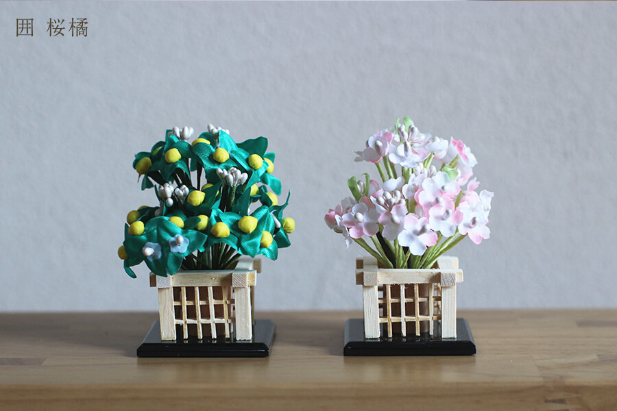 囲 桜橘:緑色と桃色のコントラストが美しい桜橘。桜と橘は古来魔除けの力が宿るとされていて、平安京遷都の折り、京都御所にも左近の桜、右近の橘が植えられました。 - 桐箱