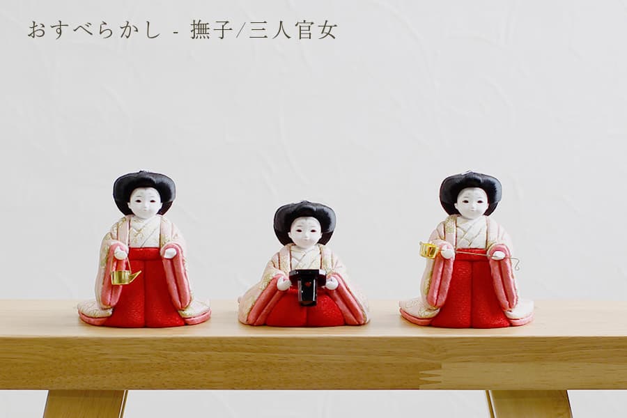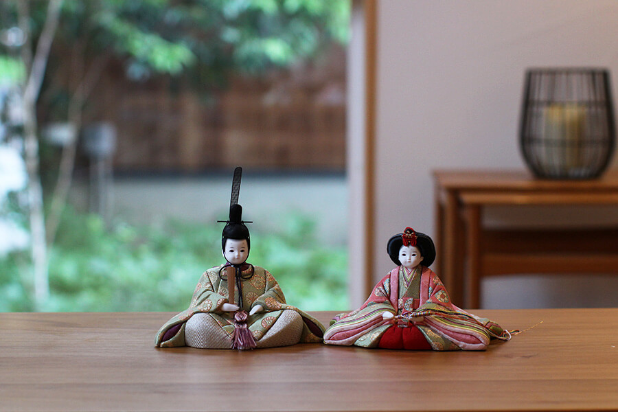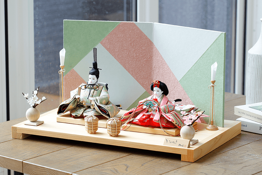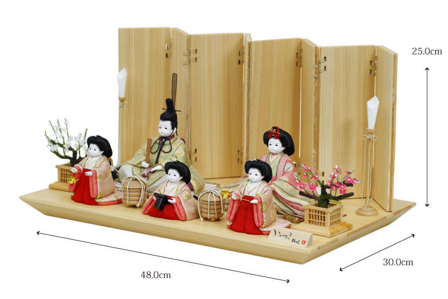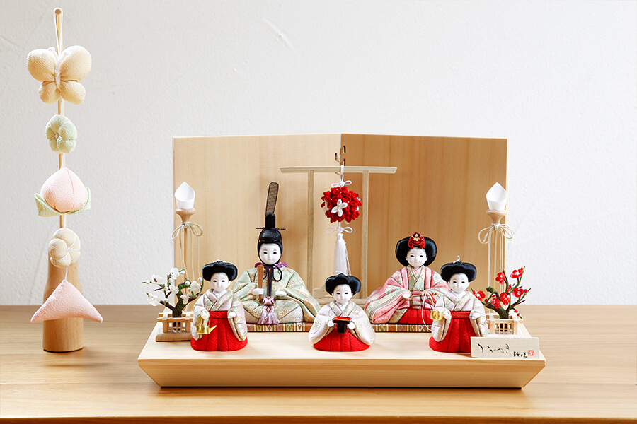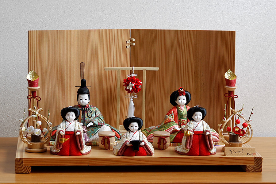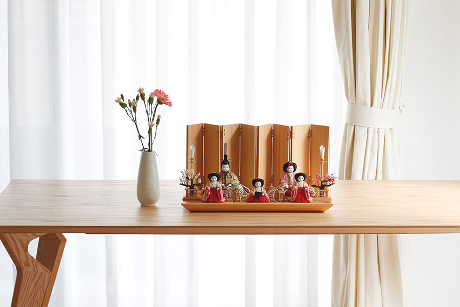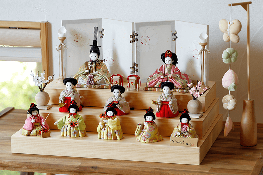 お殿様とお姫様を中心に、三人官女が華やかに並ぶ伝統的な飾りは、あたたかみのある檜の質感と相まって、自然の温もりに包まれるような雰囲気を醸し出します。