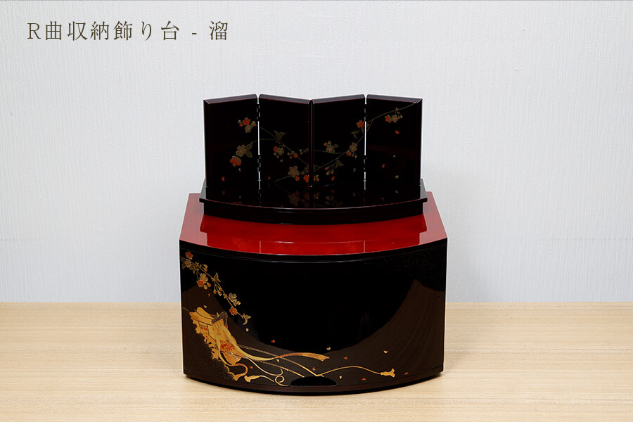 引出し収納飾り台:曲線が美しく、御所車が描かれた引出しタイプの収納飾り台です。お人形やお道具など、全て収納することができます。 - 屏風
