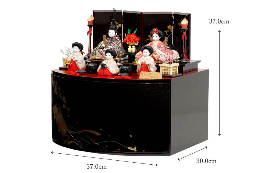 溜色の艶やかな台座と屏風に、金彩の美しい絵柄が施された、格式高いひな人形飾りです。お殿様とお雛様を中心に、三人官女が揃い、華やかで調和のとれたお飾りとなっております。