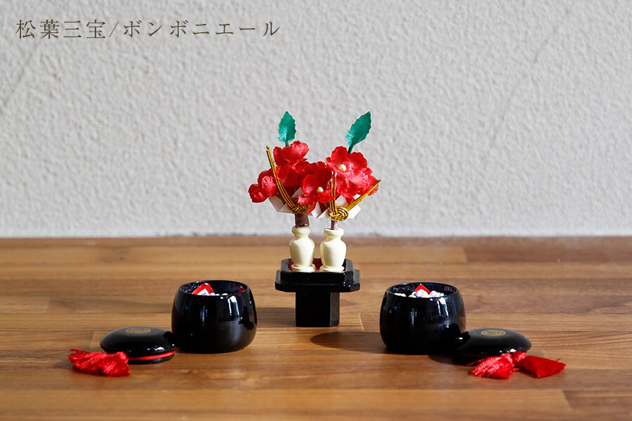 松葉三宝・ボンボニエール房付き:ボンボニエールは砂糖菓子を入れる菓子器です。皇室のお祝い事に贈られることが多く、幸せが宿る器とされていることから、慶事の贈り物に多い縁起ものです。 - お花