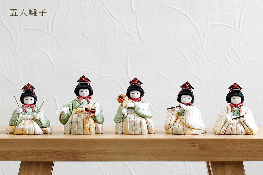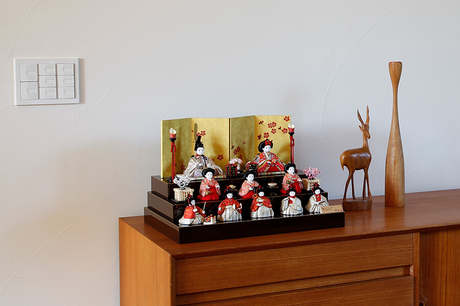 お殿様とお雛様を中心に、三人官女・五人囃子まで揃った本格仕様は、ひな祭りを格調高く彩ります。