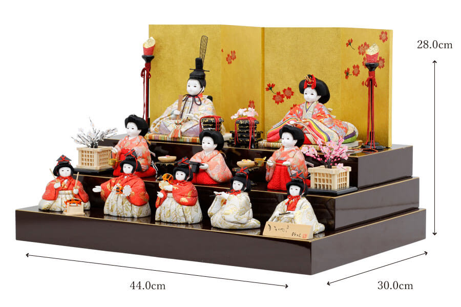 金屏風に咲き誇る桜の意匠が、気品あふれる世界を演出する三段雛飾り。