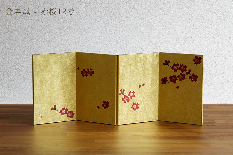 金屏風 赤桜:木の板に越前和紙を張り合わせ丁寧に仕上げました。繊細で美しい絵付けは、一筆一筆会津の職人が描いています。 ひな祭りの歌にも登場する定番の金屏風は、お雛様をより華やかに、煌びやかに演出します。 - お道具
