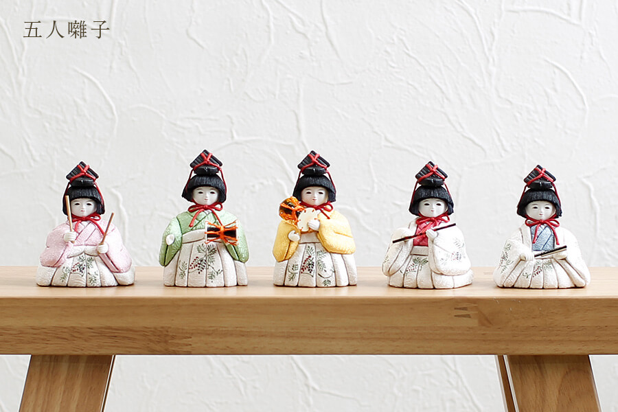お内裏様とお雛様に加え、三人官女、五人囃子が勢揃い。
