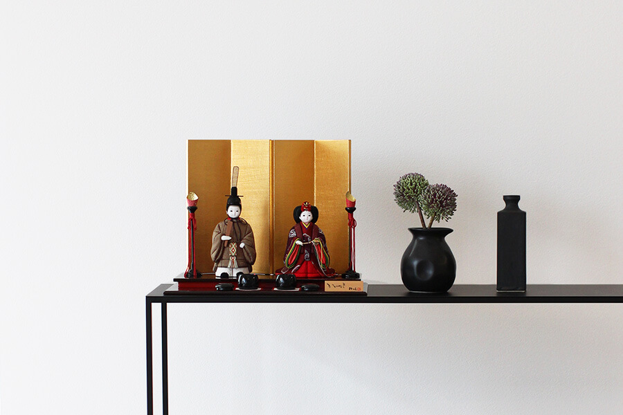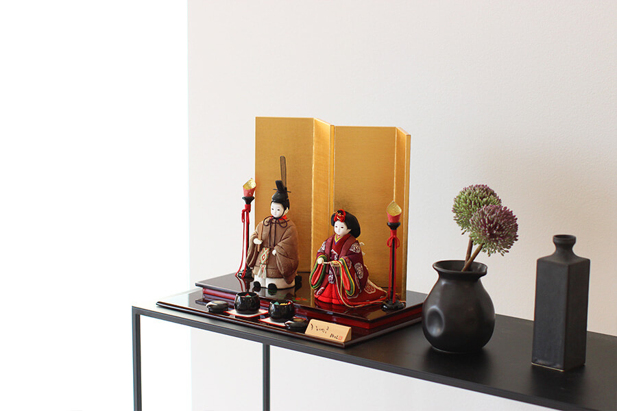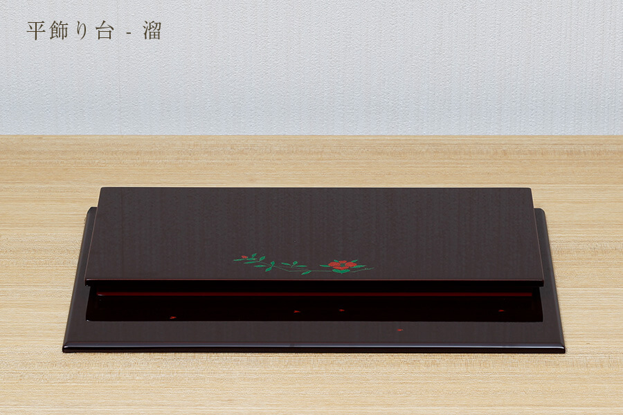 平二段飾り台:色は溜(ため)色。品の良いチョコレートブラウンです。会津の漆器職人が丁寧に仕上げました。手描きの蒔絵がお祝いに花を添えます。 - 屏風