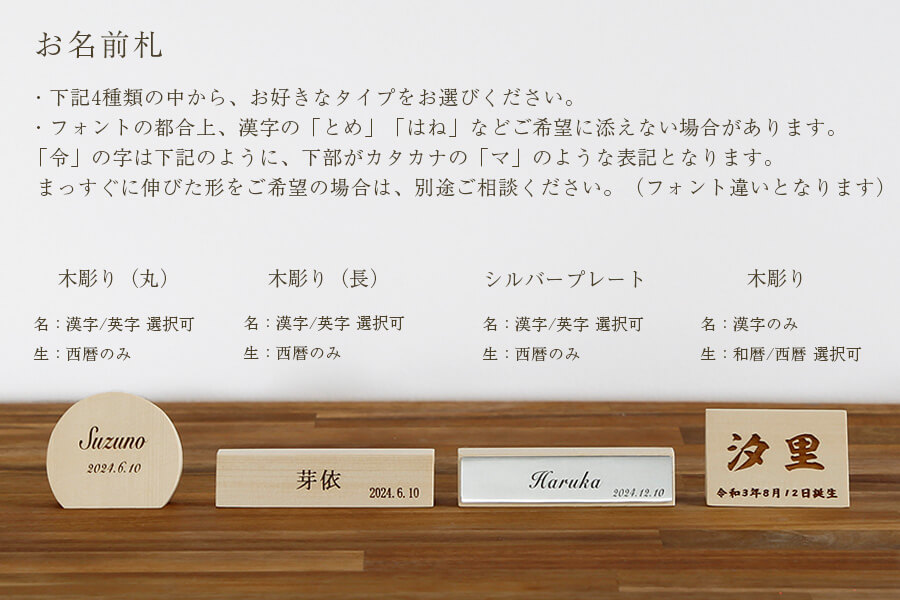 お子様ご誕生のお祝いにお名前札をプレゼント。お好きな種類をお選びください。