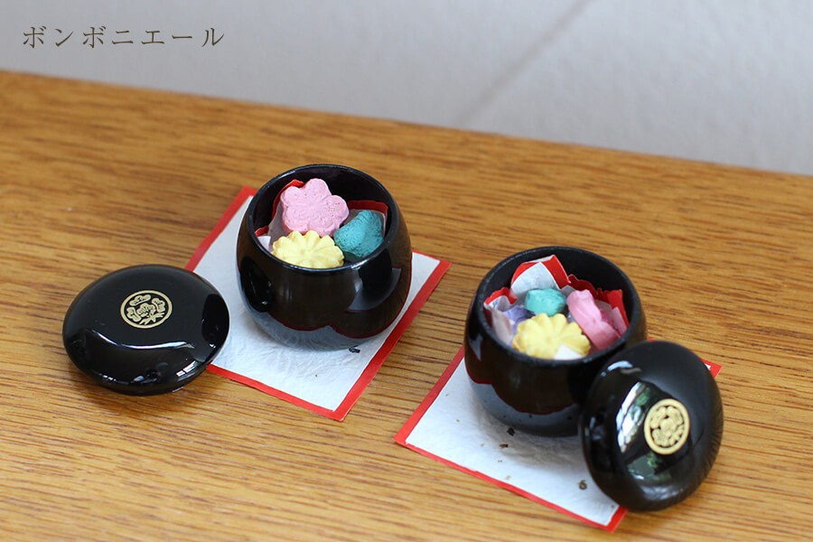 ボンボニエール:砂糖菓子を入れる菓子器です。皇室のお祝い事に贈られることが多く、幸せが宿る器とされていることから、慶事の贈り物に多い縁起ものです。 - 桐箱