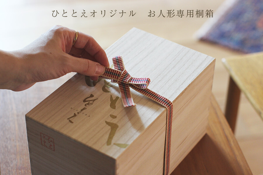 かがやきシリーズのお雛様は、ひととえオリジナルの収納箱に収めてお届けします。上品な色味に ひととえのロゴを施した高級感あふれる仕上げで、真田紐をかけて宝物のように。お雛様を専用の布地でやさしく包んでから収めます。