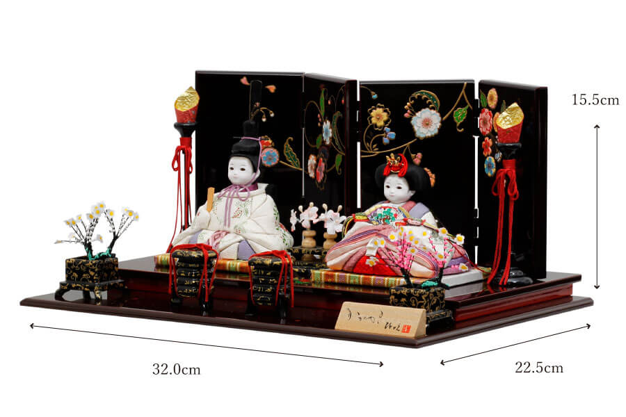 平二段飾り台:色は溜(ため)色。会津の漆器職人が丁寧に仕上げました。手描きの蒔絵がお祝いに花を添えます。 - 屏風