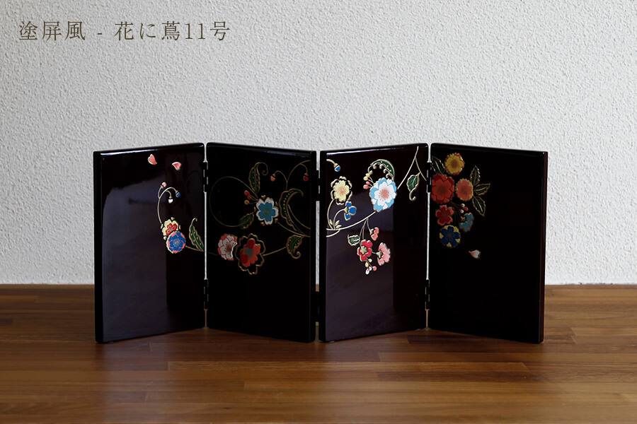 塗屏風 花に蔦:木の板に艶やかな塗りを施した高級感のあるお屏風です。塗りの飾り台との一体感が生まれ、上品な雰囲気に。職人が立体的な細工にこだわった見応えのある仕上がりです。鮮やかな色づかいと繊細な細工をお楽しみください。 - お道具