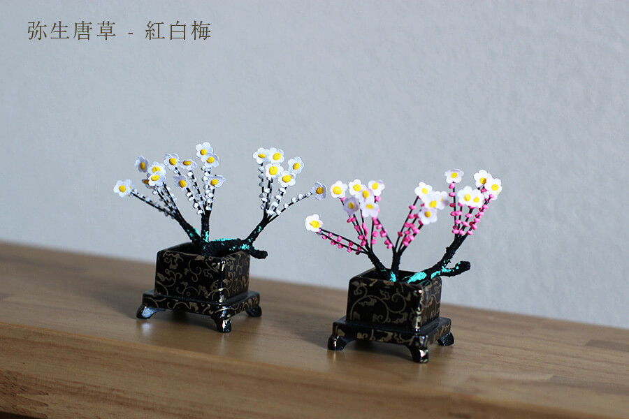 弥生唐草 紅白梅:お道具に合わせた弥生唐草文様の紅白梅です。厳しい寒さの中、いち早く春の訪れを告げ良い香りを楽しませてくれる梅は「春告草」とも呼ばれる縁起の良い花です。赤は魔よけの色、白は高貴さを象徴しています。 古くから「歳寒(さいかん)の三友」のひとつに数えられ、日本ではおめでたいことの象徴です。(歳寒の三友…松竹梅) - 桐箱