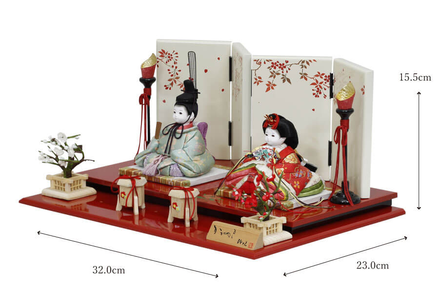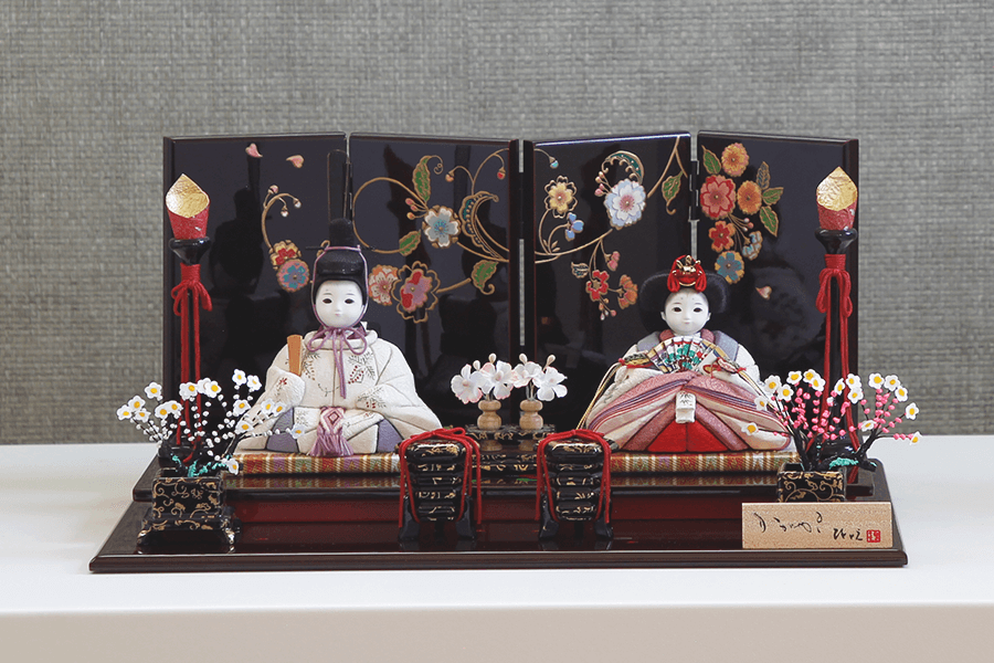 白地に山桜模様の屏風と朱色の会津塗の台座が、お人形の美しさをいっそう引き立てます。