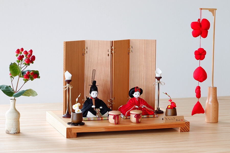 木曽檜の柾目の美しい屏風と台座は、自然の温もりを感じさせ、飾る場所を選ばずインテリアに溶け込むデザイン。