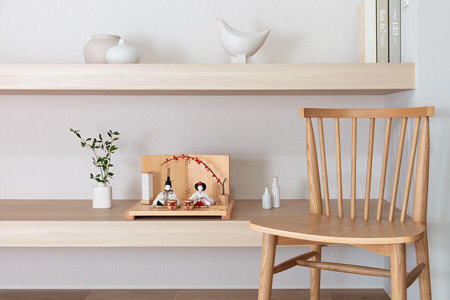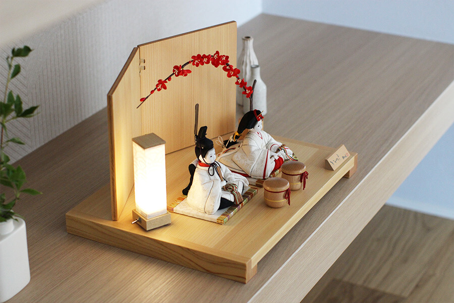 赤い花をあしらった枝飾りが、春の訪れを告げる華やかなアクセントとなり、柔らかな光を放つ照明が雛人形をより一層引き立てます。現代的でありながら伝統の雅を大切にした、洗練された雛飾りです。