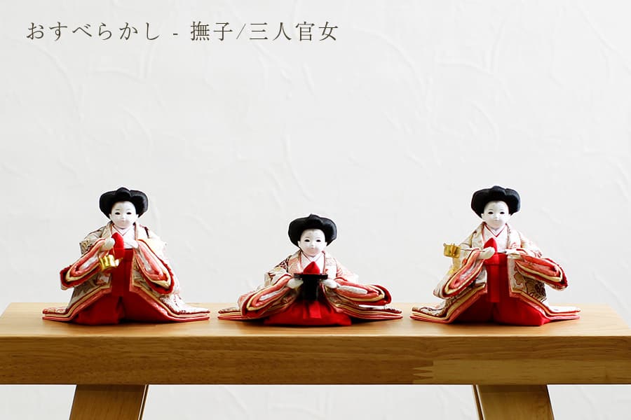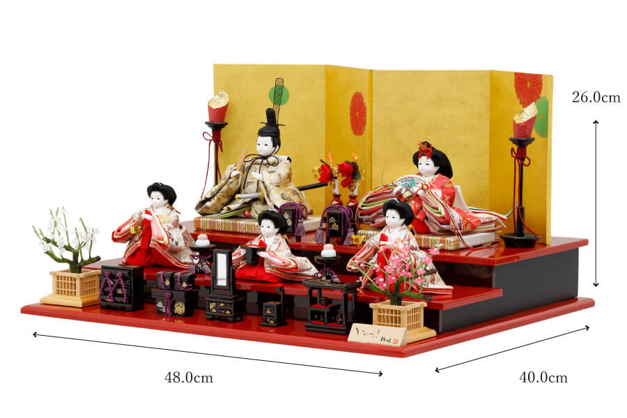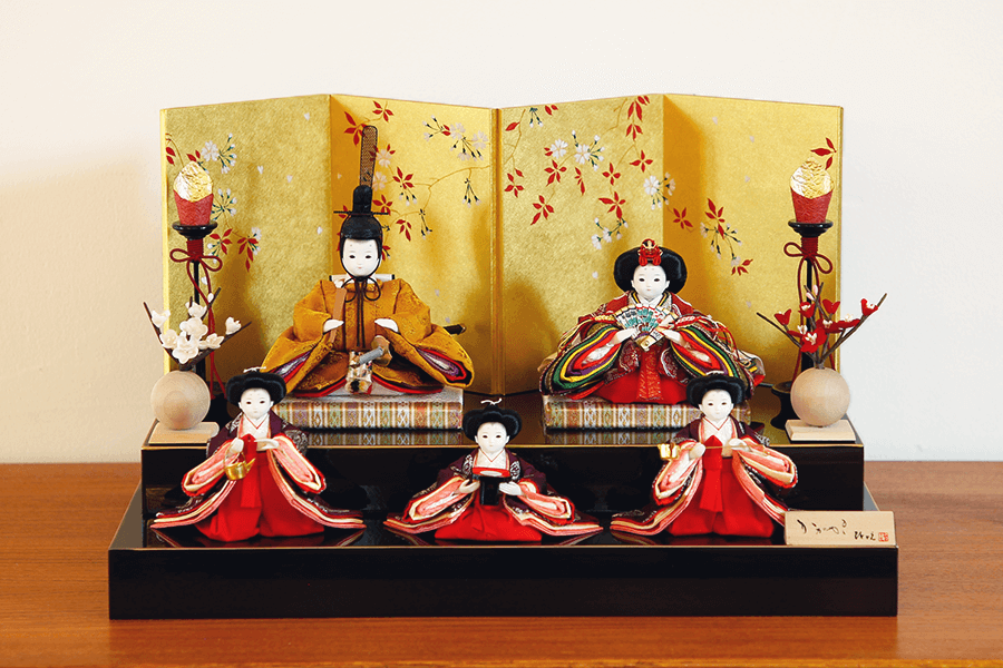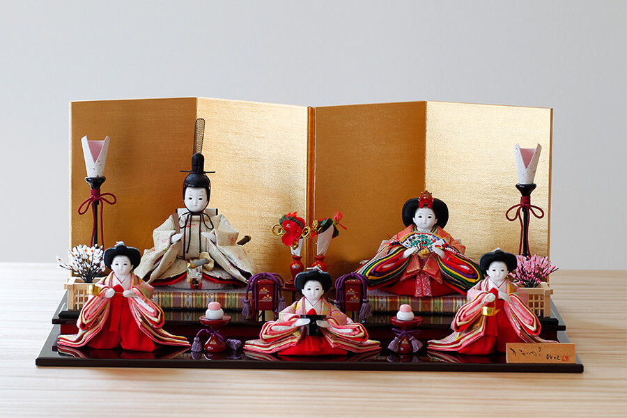 艶やかな朱赤が美しい「会津塗」の飾り台に、お殿様・お姫様をはじめ三人官女を配した格式高い五人飾り。