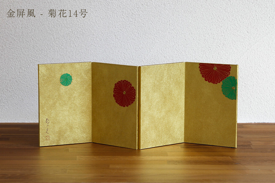金屏風 菊花:木の板に和紙を張り合わせ丁寧に仕上げました。繊細で美しい絵付けは一筆一筆会津の職人が描いているため、作品の絵付けはひとつひとつ異なり、手づくりならではの味わい深さがあります。 ひな祭りの歌にも登場する定番の金屏風は、お雛様をより華やかに、より煌びやかに演出します。