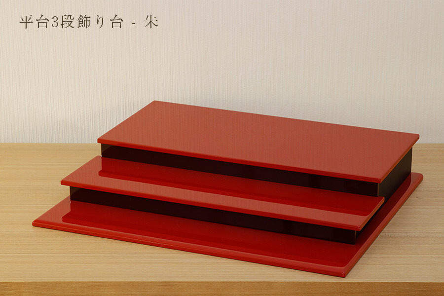 平三段:魔よけの色として知られる朱色の飾り台です。会津の漆器職人が丁寧に仕上げました。