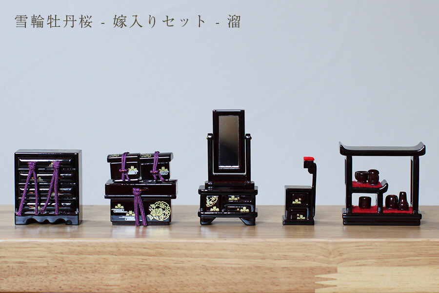 雪輪牡丹桜 嫁入りセット:嫁ぐ姫君の婚礼調度をそのままミニチュアに。お道具と同じ、雪輪牡丹桜文様を施しています。精巧につくられた箪笥の引き出しや長持の蓋は本物そのままに開きます。 - お花