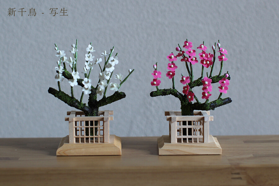 新千鳥 写生:厳しい寒さの中、いち早く春の訪れを告げ良い香りを楽しませてくれる梅は「春告草」とも呼ばれる縁起の良い花です。赤は魔よけの色、白は高貴さを象徴しています。 古くから「歳寒(さいかん)の三友」のひとつに数えられ、日本ではおめでたいことの象徴です。(歳寒の三友…松竹梅) - 桐箱
