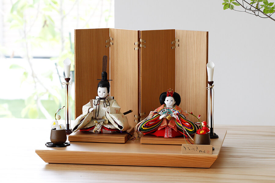 和紙屏風 白紬:飾り台に合わせた色目の越前和紙屏風。ゆったりとした二曲の屏風で気品ある佇まいに。