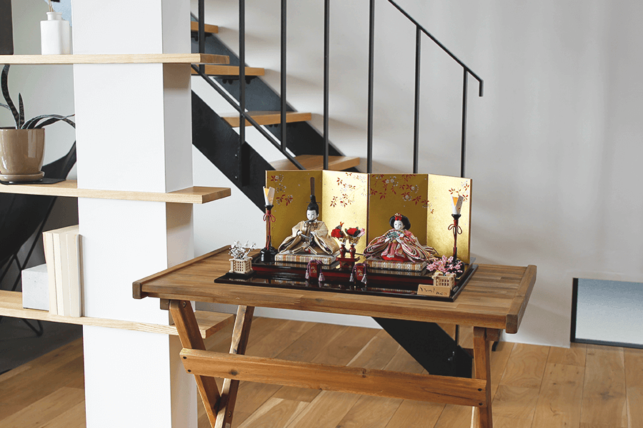 屏風には職人が一筆一筆心を込めて描いた「山桜」の絵をあしらい、春爛漫の雰囲気を演出。金地に咲き誇る桜は、お子さまの健やかな成長と幸せを願う象徴でもあります。