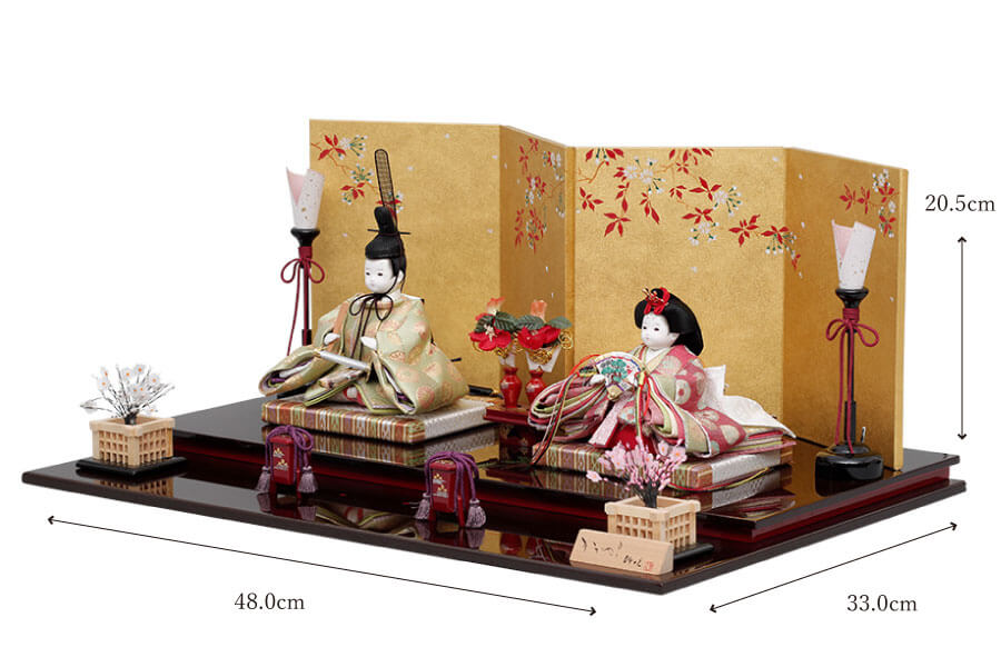 格調高い「会津塗」の伝統技法で仕上げた溜色(ためいろ)の飾り台に、金屏風が華やかに映える親王飾りです。深みのある光沢と、落ち着いた溜色の美しさが、お雛様の優雅な姿をより一層際立たせます。