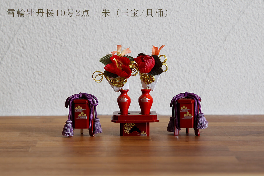 雪輪牡丹桜2点 朱(三宝/貝桶):貝桶には富貴の花と云われる牡丹や春の象徴である桜の花。桜が水面に浮かぶ流水桜文様は、慶事が続くことを意味します。 三宝に描かれた雪輪文様は豊作をもたらすと考えられた吉祥文様。縁起の良い3つの文様を描いた雪輪牡丹桜のお道具がお祝いに花を添えます。 - お花