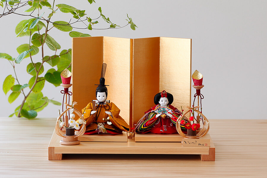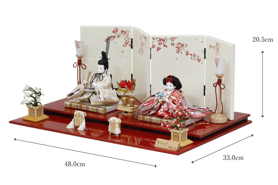 艶やかな朱色の会津塗の飾り台に、上品な会津塗の屏風を合わせた、華やかで高級感あふれる親王飾りです。