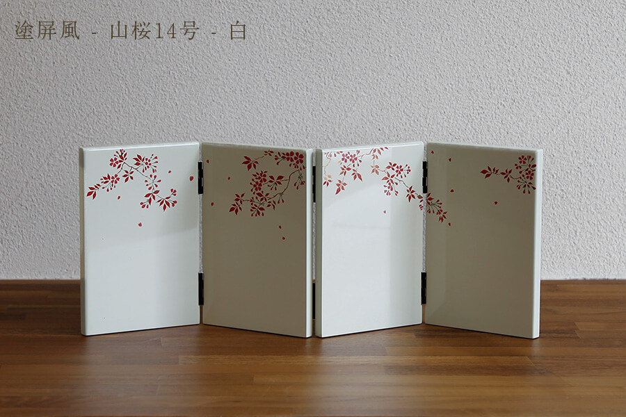 塗屏風 山桜:木の板に艶やかな塗りを施した高級感のあるお屏風です。塗りの飾り台との一体感が生まれ上品な雰囲気に。繊細で色鮮やかな桜がお雛様を彩ります。