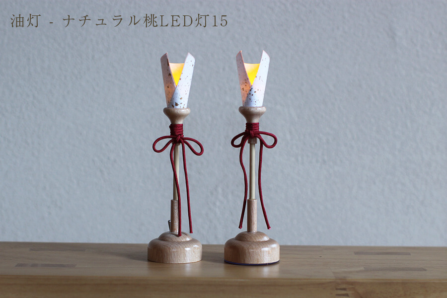油灯:ナチュラル桃LED灯:全体の色味にあわせたナチュラルの燭台。オレンジ色のあたたかい明かりが灯ります。ボタン電池式のコードレスタイプのため、飾る場所を選びません。