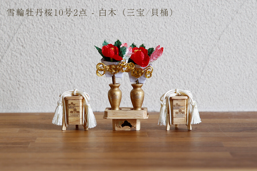 雪輪牡丹桜2点 ナチュラル(三宝/貝桶):白木のぬくもりあふれるお道具。貝桶には富貴の花と云われる牡丹や春の象徴である桜の花。桜が水面に浮かぶ流水桜文様は、慶事が続くことを意味します。 三宝に描かれた雪輪文様は豊作をもたらすと考えられた吉祥文様。縁起の良い3つの文様を描いた雪輪牡丹桜のお道具がお祝いに花を添えます。 - お花