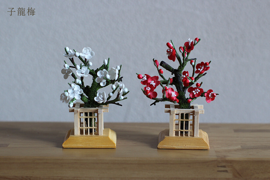 子龍梅:白梅と紅梅のコントラストが美しい紅白梅。梅の花は厳しい寒さの中、一番最初に咲いて良い香りを楽しませてくれます。古くから「歳寒(さいかん)の三友」のひとつに数えられ、日本ではおめでたいことの象徴です。(歳寒の三友…松竹梅) - 桐箱