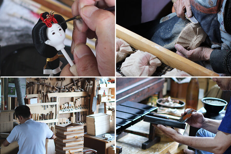 ひととえのお雛様は、衣裳は正絹、飾り台は会津塗の職人が手掛けたものや、木曽檜・天竜杉等、天然木を使用したものなど、上質な素材にこだわっておつくりしています。