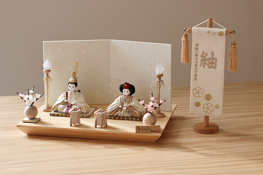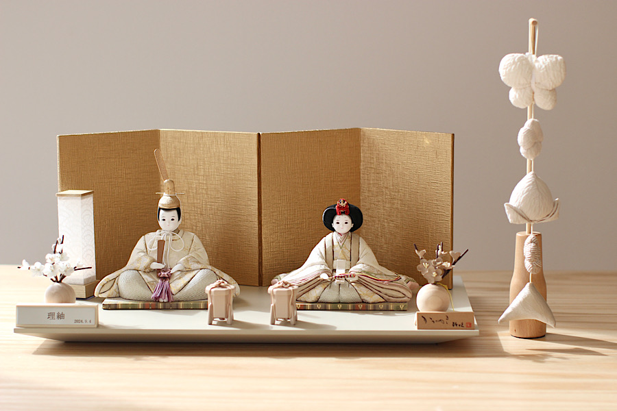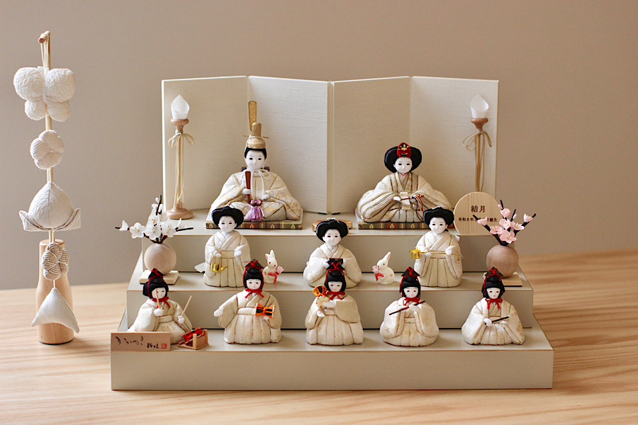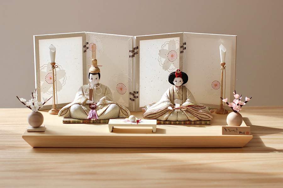 白を基調としたやさしい色合いのお雛様。