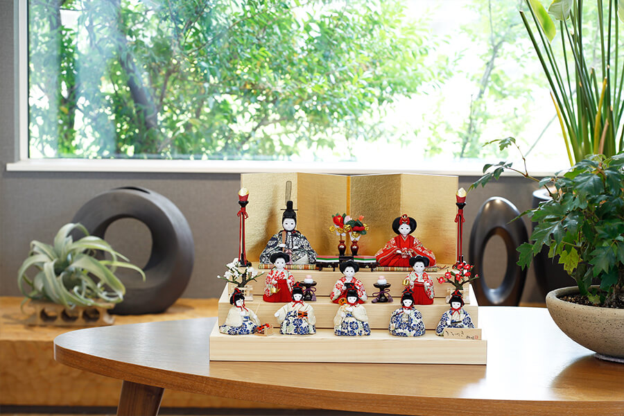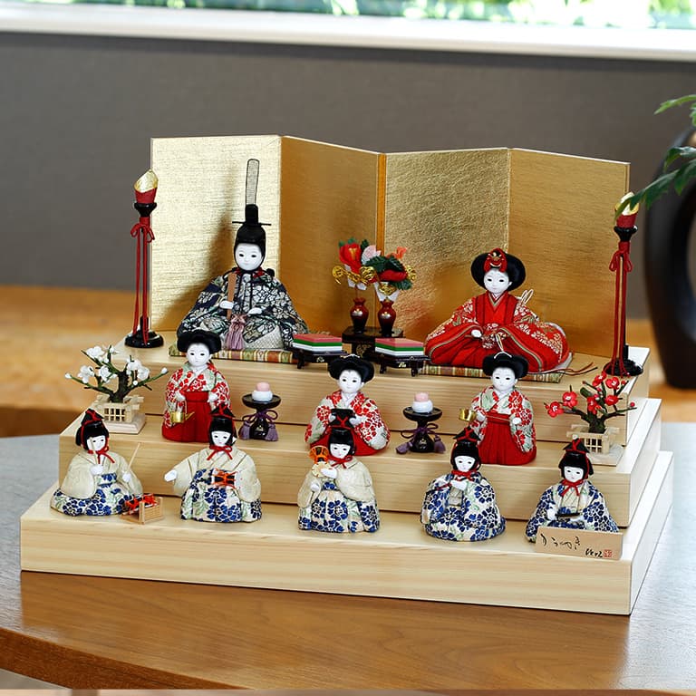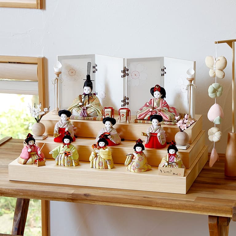 ナチュラルな木目の飾り台に鮮やかな衣裳が際立ち、和室はもちろん、洋室のインテリアにも自然に溶け込むデザイン。