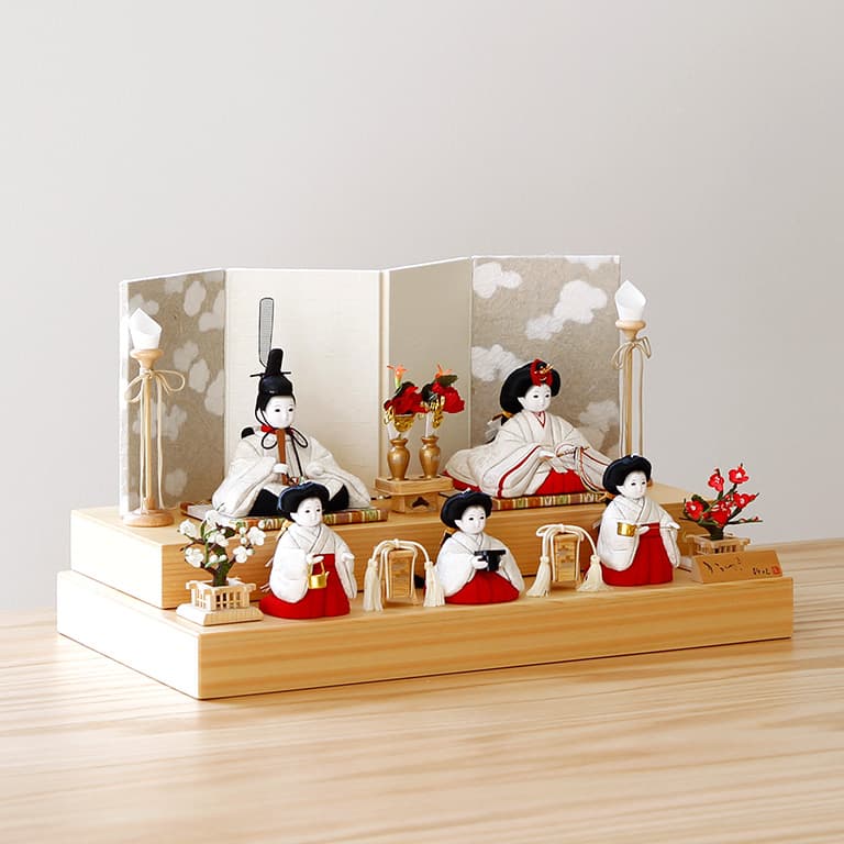 木曽檜の温もりある台座に、雪のように清らかな白を基調としたお殿様とお雛様、そして愛らしい三人官女を配した、可憐で上品な五人飾りです。