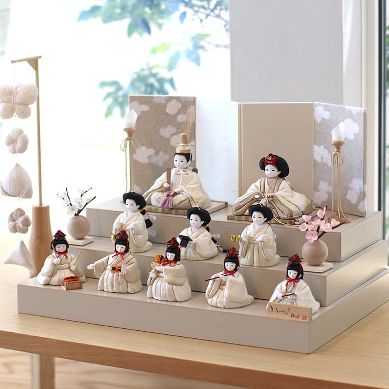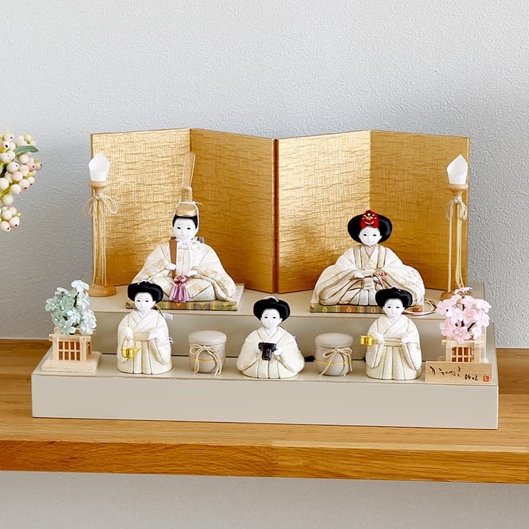 白とベージュを基調とした気品あふれる三段雛飾り。主張しすぎない柔らかな色合いが、お殿様とお雛様の存在感をいっそう引き立て、清楚で優美な世界観を演出します。