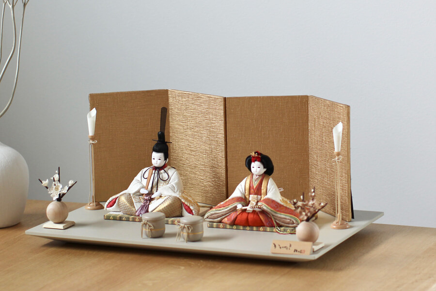 古典的な配色の衣裳に朱色の飾り台とシンプルな金屏風を合わせ、クラシックな趣に。時が経っても飽きのこない親王飾りです。