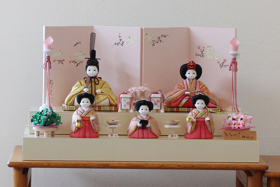 紗の三人官女は「小花梅唐草」の文様のお衣裳です。