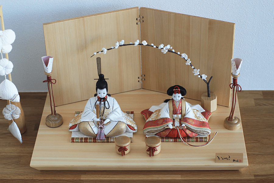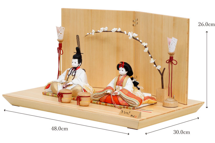 厳選された木曽檜を贅沢に使用した飾り台と屏風が、お人形の気品を一層際立たせる親王飾りです。
