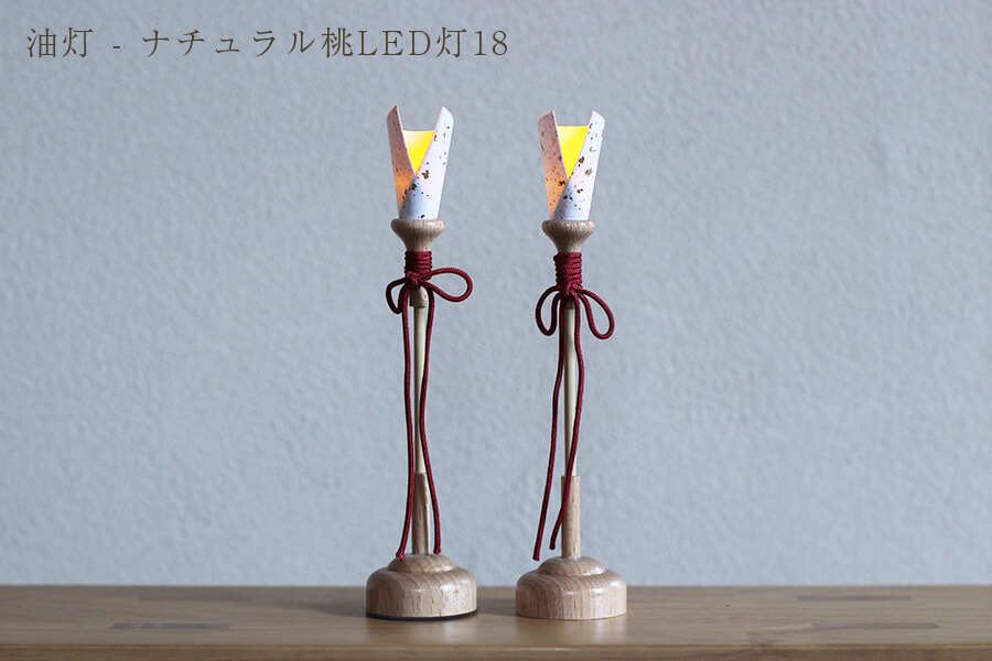 油灯 ナチュラル桃LED灯:全体の色味にあわせたナチュラルの油灯。電池式でオレンジ色のあたたかい明かりが灯ります。